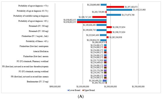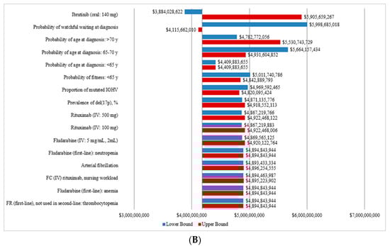 Sensitivity analysis of the total annual costs a of CLL for the CIT and the OTT scenarios. (A) Tornado diagram for the one-way sensitivity analysis of the total annual cost for the CIT scenario. (B) Tornado diagram for the one-way sensitivity analysis of the total annual cost for OTT scenario. CIT, chemoimmunotherapy; CLL, chronic lymphocytic leukemia; del(17p), deletion at chromosome 17p targeting the TP53 gene; FC, fludarabine, cyclophosphamide; FR, fludarabine and rituximab; IGHV, immunoglobulin heavy-chain variable; IV, intravenous; OTT, oral targeted therapy. a All costs are shown in 2019 Canadian dollars.