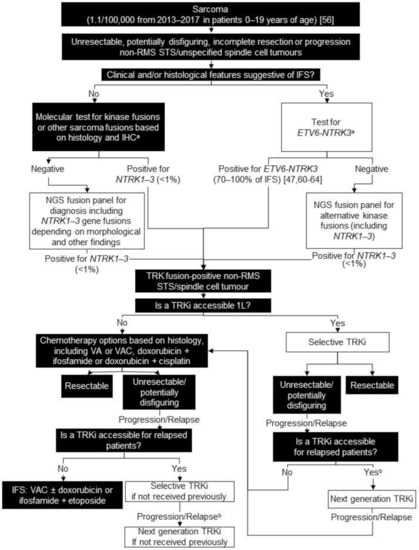 Biomarker testing and treatment for neurotrophic tyrosine receptor kinase (NTRK) gene fusions in sarcoma. White boxes with black outlines represent either NTRK gene fusion testing or treatment with a TRKi. Black boxes with white text indicate all other steps that do not include either NTRK gene fusion testing or treatment with a TRKi. a At discretion of lab; b Consider re-biopsy and molecular test to confirm acquired resistance mutation. ETV6 = ETS variant transcription factor 6; IFS = infantile fibrosarcoma; IHC = immunohistochemistry; L = line; NGS = next generation sequencing; RMS = rhabdomyosarcoma; STS = soft tissue sarcoma; TRK = tyrosine receptor kinase; TRKi = TRK inhibitor; VA = vincristine and adriamycin; VAC = vincristine, adriamycin, and cyclophosphamide. Knezevich et al. 1998 [47]; National Cancer Institute [56]; Knezevich et al. 1998 [60]; Bourgeois et al. 2000 [61]; Rubin et al. 1998 [62]; Sheng et al. 2001 [63]; Loh et al. 2002 [64].