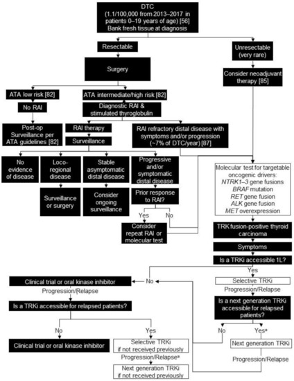 Biomarker testing and treatment for neurotrophic tyrosine receptor kinase (NTRK) gene fusions in differentiated thyroid cancer. White boxes with black outlines represent either NTRK gene fusion testing or treatment with a TRKi. Black boxes with white text indicate all other steps that do not include either NTRK gene fusion testing or treatment with a TRKi. a Consider re-biopsy and molecular test to confirm acquired resistance mutation. ALK = ALK receptor tyrosine kinase; ATA = American Thyroid Association; BRAF = B-Raf proto-oncogene, serine/threonine kinase; DTC = differentiated thyroid carcinoma; L = line; MET = MET proto-oncogene, receptor tyrosine kinase; RAI = radioactive iodine; RET = ret proto-oncogene; TRK = tyrosine receptor kinase; TRKi = TRK inhibitor. National Cancer Institute [56]; Francis et al. 2015 [82]; Kazahaya et al. 2020 [85]; Schmidt et al. 2017 [87].