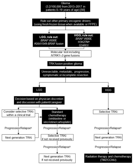 Biomarker testing and treatment for neurotrophic tyrosine receptor kinase (NTRK) gene fusions in glioma. White boxes with black outlines represent either NTRK gene fusion testing or treatment with a TRKi. Black boxes with white text indicate all other steps that do not include either NTRK gene fusion testing or treatment with a TRKi. a Rare cases of NTRK fusion and H3K27M mutation have been described; b Consider re-biopsy and molecular test to confirm acquired resistance mutation. BRAF = B-Raf proto-oncogene, serine/threonine kinase; FFPE = formalin-fixed paraffin-embedded; HGG = high grade glioma; IHC = immunohistochemistry; LGG = low grade glioma; TMZ/CCNU = temozolomide and lomustine; TRK = tyrosine receptor kinase; TRKi = TRK inhibitor. National Cancer Institute [56].
