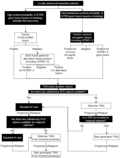 Biomarker testing and treatment for neurotrophic tyrosine receptor kinase (NTRK) gene fusions. White boxes with black outlines represent either NTRK gene fusion testing or treatment with a TRKi. Black boxes with white text indicate all other steps that do not include either NTRK gene fusion testing or treatment with a TRKi. a Consider re-biopsy and molecular test to confirm acquired resistance mutation. NGS = next generation sequencing; SOC = standard of care; TRK = tyrosine receptor kinase; TRKi = TRK inhibitor.