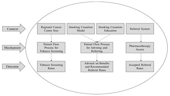 Context variables were the Cancer Centre Size, Smoking Cessation Education, Smoking Cessation Model and Referral System. Mechanism variables were the Patient Flow Process for Tobacco Screening, the Patient Flow Process for Advising and Referring, and Pharmacotherapy.