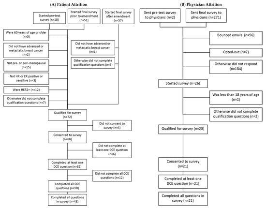 A total of 118 patients started the survey, including 10 who started the pretest, 51 who started the final survey prior to the amendment, and 57 who started after the amendment. Of these, 27 met eligibility criteria for the primary analysis, including 23 who consented to the survey and completed at least one discrete choice task, and 17 who completed all questions in the survey. Among all patients, 72 qualified for the survey, 68 consented to the survey, 62 completed at least one DCE question, and 48 completed all survey questions. A total of 271 physicians were sent the e-mail invitation to participate in the survey, and two physicians were sent the pre-test survey. Of these, 26 started the survey, 23 qualified for the survey, 21 consented to the survey, and 21 completed at least one DCE question. All the physicians who started the DCE completed all the DCE tasks. Figure 1 summarizes the patient and physician attrition for the survey.