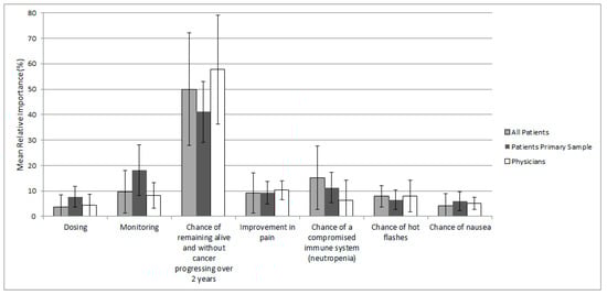 - Beusterien, K.; Grinspan, J.; Kuchuk, I.; Mazzarello, S.; Dent, S.; Gertler, S.; Bouganim, N.; Vandermeer, L.; Clemons, M. Use of conjoint analysis to assess breast cancer patient preferences for chemotherapy side effects. Oncologist 2014, 19, 127–134. [Google Scholar] [CrossRef] [PubMed]
