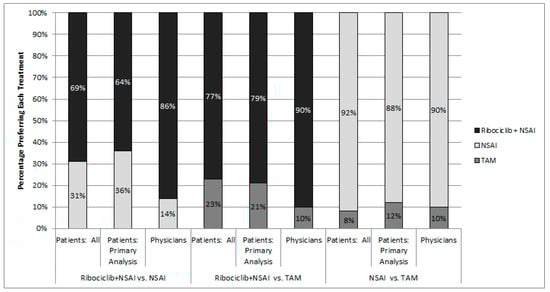 Results of the head-to-head comparisons of treatments are reported in Figure 3. The treatment with attributes consistent with ribociclib + NSAI was the most frequently selected alternative for both patients and physicians. In the fixed choice tasks comparing treatments corresponding to ribociclib + NSAI versus an NSAI, physicians were more likely than patients to prefer ribociclib + NSAI. Physicians chose ribociclib + NSAI over NSAI 86% of the time compared with 64% for patients in the primary analysis and 69% for all patients. For the fixed-choice task comparing treatments corresponding to ribociclib + NSAI versus TAM, physicians were more likely than patients to prefer with ribociclib + NSAI than TAM. Physicians chose ribociclib + NSAI over TAM 90% of the time compared with 79% for the primary patient analysis and 77% for all patients. Physicians and patients similarly preferred an NSAI to TAM.