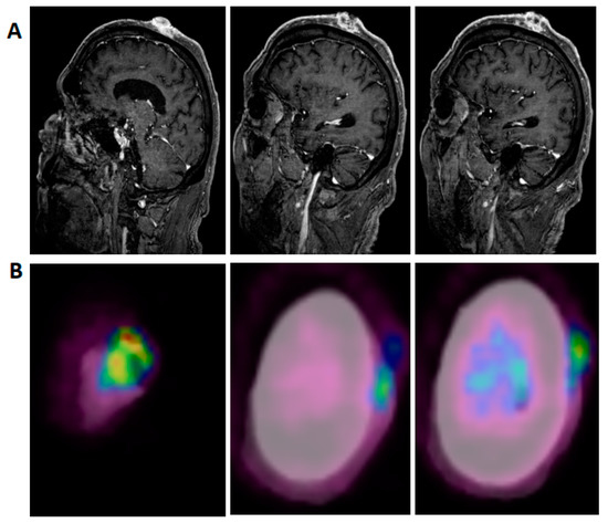 Representative pre-treatment, post-contrast, T1-weighted, sagittal MRI images (A) and fused PET-CT images (B) show disease extension predominantly from the vertex scalp to the left lateral temple region.