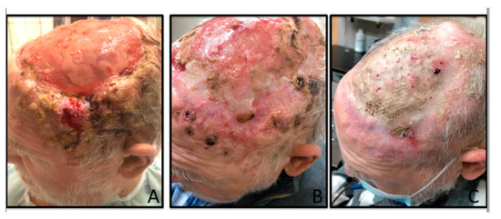 Patients who undergo a renal transplant are approximately three times more likely to develop different type of cancers than the general population [5]. Risk factors specific to the transplant population include the type, extent, and duration of immunosuppression. CSCC is the most common skin cancer in renal transplant patients. In comparison with SCC in immunocompetent patients, SCC in organ transplant recipients is more likely to manifest as aggressive disease [6,7,8]. While the modulation of immunotherapy plays an important role in the management of these patients, additional cancer-directed treatments are often necessary to achieve appropriate tumor control. Systemic therapies based on platinum agents, capecitabine, or cetuximab can help achieving tumor responses, but such responses are generally short-lived; additionally, these drugs can be problematic in patients with a suboptimal performance status due to multiple comorbidities.