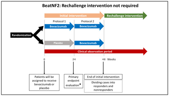 A schematic illustration showing the protocol without rechallenge intervention in the Randomized Double-Blind Multicenter Trial to Assess the Efficacy and Safety of Bevacizumab for Neurofibromatosis Type 2 (BeatNF2) trial. Patients who did not respond to the initial intervention and those who responded without developing deterioration in the hearing will not require rechallenge intervention. * The study’s primary endpoint is improved hearing function 24 weeks after the beginning of the treatment protocol.