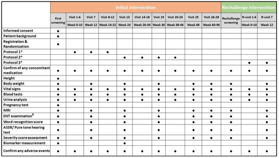 An outline of the study assessments and procedures scheduled. Each circle represents a task or test performed every two weeks. * Description of these protocols can be seen in Figure 2 and Figure 3. ‡ ENT examination before the pure-tone test. ASSR, auditory steady-state response; ENT, ear, nose, and throat; MRI, magnetic resonance imaging.