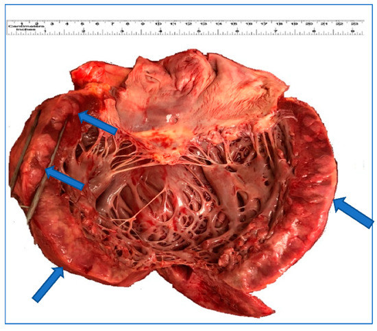 Gross appearance of the heart. The left myocardium shows and focal thickening and white-brown discoloration (arrow) that corresponds to leukemic infiltration.