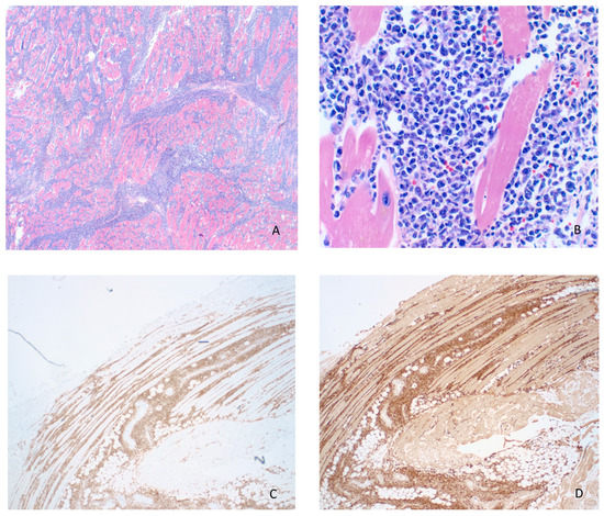 The patient underwent two cycles of chemotherapy (ESHAP-etoposide, methylprednisolone, cytarabine and cisplatin), but unfortunately had a complicated post-treatment course and developed tumor lysis syndrome, gastrointestinal bleeding, exacerbation of heart failure and unresolved acute kidney injury. Despite intensive care and cardiopulmonary resuscitation, the patient developed cardiac arrest and died 45 days after hospitalization. An autopsy revealed extensive lymphomatous involvement of multiple lymph nodes, including mesenteric, mediastinal, retroperitoneal, cervical and periaortic. In addition, significant involvement of the left myocardium (Figure 1) and multiple other organs (bilateral lungs, stomach, bowels, pancreas, bilateral kidneys, bilateral adrenals and prostate) and patchy involvement of diaphragm, skin and muscle was demonstrated by histomorphology and immunohistochemistry (including sections from the cardiac lymphoma shown in Figure 2).