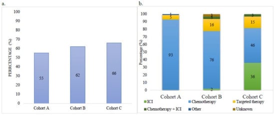 (a) Rate of first-line palliative systemic treatment in each cohort in patients with stage IV non-small cell lung carcinoma (NSCLC); (b) rate of first line therapies for each cohort. Percentages may not total 100 because of rounding.