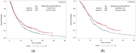 For comparative OS analysis between different time periods, patients in cohort B were combined to those in cohort C, which resulted in cohort D. Median OS was longer in cohort D compared to cohort A (8.4 vs. 7.5 months, p < 0.01) (Figure 2a). Among patients who received any systemic therapy, OS was longer in cohort D than cohort A patients (12.6 vs. 10.8 months, p <0.01) (Figure 2b). Survival was poor and not statistically significantly different among untreated patients in cohort A vs. D (3.9 vs. 3.5 months, p < 0.35) (Figure 2c). When analyzing by age, in treated/untreated younger patients (less than 70 years), median OS was also longer in cohort D compared to cohort A (10.5 vs. 8.7 months, p < 0.01) (Figure 2d). There was no statistically significant difference in median OS for treated/untreated patients 70 years or above between cohorts A vs. D (6.2 vs. 6.5 months, p <0.24) (Figure 2e).
