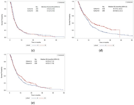 Overall survival (OS) of all patients with stage IV non-small cell lung carcinoma (NSCLC) in cohort A vs. D: (a) all patients treated and untreated; (b) treated patients only; (c) untreated patients only; (d) patients < 70 years; (e) patients ≥ 70 years. CI, confidence interval.