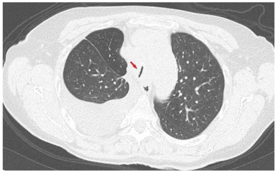 Chest computed tomography (CT) scan: axial lung image showing huge reduction (arrow) of the trachea lumen (2 mm) due to mediastinal pathological tissue.