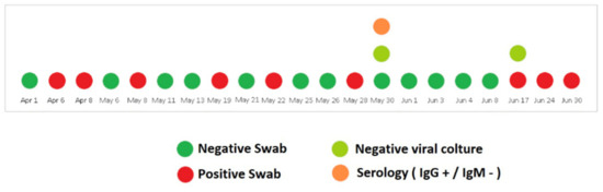 The patient did not develop any coronavirus disease 2019 (COVID-19)-related symptoms, but nasopharyngeal swabs were persistently positive for SARS-CoV-2 for over one month. On 13 May after two consecutive negative swabs, she was transferred to the oncology ward to start radiotherapy treatment. Her ECOG PS was 3. Unfortunately, on May 19, the nasopharyngeal swab for SARS-CoV-2 RNA was positive. Once again the radiotherapy was postponed and the patient was isolated in the infectious diseases ward. The clinical conditions remained stable and the nasopharyngeal swabs were repeated at regular intervals with alternating results (Figure 2). On 30 May, a viral culture with Vero cells [13] was performed and resulted negative. The same result was achieved also 15 days later, despite the occurrence of new positive swabs.