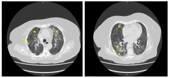 The woman’s current complaint started a couple of days before with dyspnea, delirium, and fever. Diffuse rhonchi were found on pulmonary auscultation. The results of the blood analysis were as follows: leukocytes 8.1 × 109 cells/L, neutrophils 7 × 109 cells/L, lymphocytes 0.46 × 109 cells/L, platelets 398 × 109 cells/L, hemoglobin 10.1 g/dL, and C-reactive protein 341 mg/L. The chest computed tomography (CT) scan showed multiple bilateral apical and peri-hilar ground glass opacities (GGO) associated with subpleural condensation. These findings were classified as possible diffuse COVID-19 pneumonia (Figure 1) by the radiologist [1]. However, the RT-PCR (Reverse Transcription Polymerase Chain Reaction) for SARS-CoV-2 performed on nasopharyngeal swab on admission, two days after the symptoms began, was negative. A diagnosis of COVID-19 was nonetheless initially retained and the patient received dexamethasone recommended by the Recovery trial [2,3]. When the initial course was not favorable, oxygen therapy was increased, and a second RT-PCR for Sars-Cov-2 was negative. We performed a blood (1-3)-Beta-D-glucan test, which was positive at 90 pg/mL (negative <60 pg/mL, equivocal between 60 and 80 pg/mL, positive above 80 pg/mL). PCR for Pneumocystis jirovecii was positive on bronchoalveolar lavage. The final diagnosis was Pneumocystis jirovecii pneumonia (PJP), and the patient responded favorably to treatment with sulfamethoxazole-trimethoprim (SMX-TMP). After discussion with the pulmonologists, gefitinib was considered to be potentially responsible for the infection.