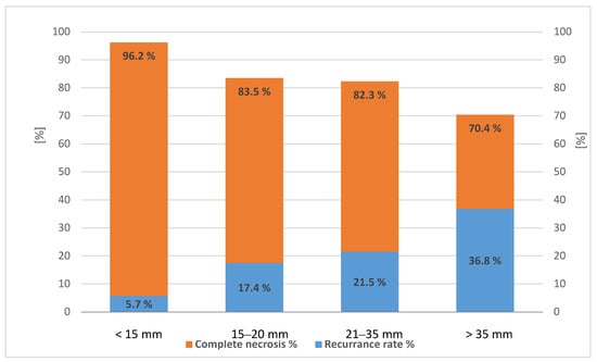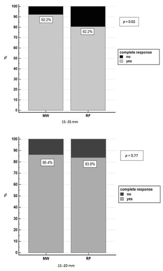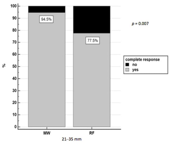 Considering reviews and meta-analyses, no differences in local recurrence for up to five years after treatment were found comparing MWA and RFA, and MWA is recommended only for lesions >3 cm [8,17,18,19,20]. A possible explanation for the higher complete response rate with MWA found in the 21–35 mm group in comparison with the 15–20 mm group in our study could be that MWA antenna can achieve continuous and faster heating, thus generating a larger area of ablation than RFA [21,22]