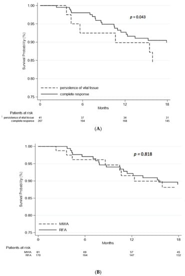 Death occurred in 58 out of 251 (23%) patients. At multivariate analysis, overall survival was related to the Child Pugh A vs. B score (HR = 3.46, 95%CI 1.68–7.13, p = 0.001), and to the SOD (HR = 1.04, 95%CI 1.01–1.07, p = 0.005). Patients who achieved complete response after thermoablation showed increased overall survival compared to patients with persistence of vital tissue (p = 0.043, see Figure 3A). The mortality risk between patients treated with RFA (N = 15, 18.5%) and MWA (N = 43, 25.3%) was similar (HR = 0.97, 95%CI 0.50–1.89, p = 0.938). In Figure 3B, the overall survival probability of patients in the two groups of treatment is reported.