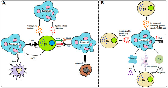 NK cell population is about 10–15% in a whole of human peripheral blood lymphocytes and is regarded as a natural killer as they have cytotoxic properties against tumor cells without any prior priming (e.g., as required by CD8 T cells) [18]. They have been considered of great importance in terms of immunosurveillance, as they recognize and kill different types of target cells, such as virus-infected cells and malignant cells. The majority (~90%) CD56dim of the total NK cell population in peripheral blood expresses high levels of FcγRIII (CD16), whereas a small population (~10%) CD56bright of NK cells are mostly involved in the production of cytokines [18,19]. NK cells do not undergo antigen-specific receptor rearrangement as T and B lymphocytes, instead of the functional activities of NK cells to lyse the target process through their germline-encoded immunoreceptors [20]. NK cells protect the host from infectious or cancers by expressing activating and inhibitory receptors. Activated NK cells can recognize and eliminate the target cells by the balance of the signaling derived from inhibitory receptors (e.g., KIRS or NKG2A) and activating receptors (e.g., NCRs or NKG2D) [21,22]. Moreover, NK cells are involved in the regulation of the immune response by the expression of different chemokines and chemokine receptors such as CCL4, CXCL8, and CXCR3 [23,24]. Klas Karre, the first person, as part of his doctoral thesis, proposed that NK cytolysis of a target cell could be triggered by a decrease or absence of host major histocompatibility class I molecules (MHC-I) on the surface of a target cell [25]. This hypothesis was then confirmed by several other groups [26,27,28]. NK cells are inactivated when their inhibitory receptors identify the self-MHC class I molecule, and thus they can protect the cells from host cell attacking [29]. In cancer patients who are low/deficient of MHC-class I or bear “altered-self” stress-inducible proteins can be targeted by NK cell killing and cytotoxicity "the missing self-hypothesis" of Klas Karre [25]. NK cells kill tumor cells through several mechanisms, including the release of cytoplasmic granules containing perforin and granzyme, secretion of immunoregulatory cytokines such as nitric oxide (NO), and expression of other TNF-family members such as Fas-L or TRAIL (Figure 1A). However, tumor cells can evade host immune response via multiple strategies, including weak immunogenicity of target antigens and the creation of an immune-suppressive tumor environment (Figure 1B).