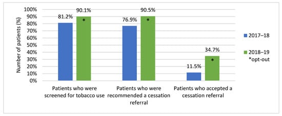 A comparison of the percentage of patients screened for tobacco use, the percentage of patients offered a referral to a quit smoking service, and the percentage of patients who accepted an offered referral in 2017/2018 and 2018/2019, respectively.