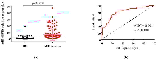 miR-618 expression in serum was found to be significantly increased in mCC patients’ blood in comparison with healthy controls (p < 0.0001, Figure 1a). To evaluate the potential diagnostic value of miR-618, the ROC curve has been used (Figure 1b). At the optimal cutoff value, miR-618 could significantly distinguish between mCC patients and healthy controls with AUC = 0.79 (95% CI: 0.72–0.86, p < 0.001) and with a sensitivity of 79.81% and specificity of 72.22%.