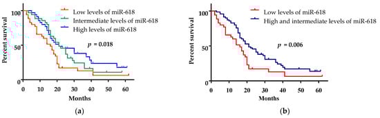 Patients were divided into three groups according to their expression levels of miR-618—with low (up to the 33th percentile, range: 0.008–0.754), intermediate (between the 33th and 66th percentile, range: 0.755–4.661) and high expression (over the 66th percentile, range: 4.662–46.690). The patients with low expression of miR-618 had a mean overall survival of 16 months (95% CI: 11.17–20.83, Figure 2a), while the mean overall survival of patients with intermediate and high expression of miR-618 was the same—21 months (95% CI: 16.44–25.56 and 95% CI: 5.99–36.02, respectively, Figure 2a). Because of their similar mean overall survival, the groups with high and intermediate expression of miR-618 were combined for subsequent analyzes. Patients with low expression of circulating miR-618 had a significantly shorter mean overall survival (16 months; 95% CI: 11.17–20.83) than patients with high/intermediate expression (21 months, (95% CI: 15.83–26.17) (log-rank test, p = 0.006, Figure 2b).
