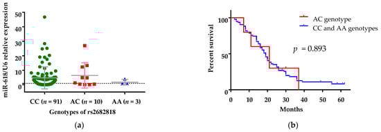 (a) Levels of circulating miR-618 in patients with mCC carrying different genotypes of rs2682818. There were no significant differences between rs2682818l genotypes in regard to expression of miR-618 (Mann-Whitney U test, data are presented as mean ± SD). (b) Kaplan–Meier survival analysis for assessment of AC vs. CC and AA genetic model of rs2682818 and the overall survival of mCC patients. Patients carrying AA genotype and those carrying CC/AA genotypes did not have statistically different overall survival (p = 0.893).