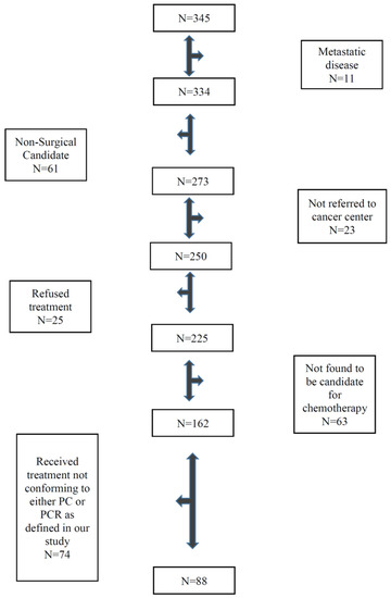 Using ICD codes, a total of 345 patients with stomach and GE junction cancers who were diagnosed in Saskatchewan during the study period were identified. Of 345 patients, only 88 patients were found to fulfill eligibility criteria (Figure 1). Most patients were excluded because of metastatic disease, poor performance status, or major active comorbid illnesses, were not candidates for surgery or chemotherapy, or declined standard treatment. In addition, patients with GE junction cancer who were treated with preoperative chemoradiotherapy or those who received postoperative chemotherapy alone were excluded. Of 88 patients, 67 patients received PCR and 21 patients received PC. ECF (epirubicin, cisplatin and infusional 5FU) was the most common regimen and was used in 62% patients followed by EOF (epirubicin, oxaliplatin and infusional 5FU). Only one patient received the FLOT (5FU, oxaliplatin and docetaxel) regimen. Patients’ baseline characteristics are described in Table 1. Despite small numbers, the two groups were relatively well-balanced. The median age of the entire cohort was 63 years. The majority of the patients were men. Most patients had an WHO performance status of 0 or 1, 97% for the PCR group and 100% for the PC group. Most patients had clinical stage I or II cancer, 92% in the PCR group and 85% in the PC group. Post-surgery with or without preoperative chemotherapy pathological stage III was 52% for the entire cohort, 55% in the PCR group vs. 43% in the PC group. About two-thirds of patients had grade 3 tumors.