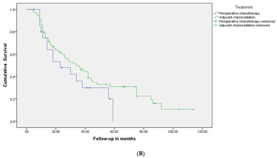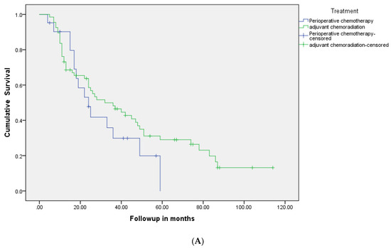 (A): Kaplan-Meier relapse-free survival curves of two groups: patients who were treated with perioperative chemotherapy compared to those who received adjuvant chemoradiotherapy. (B): Kaplan-Meier overall survival curves of two groups: patients who were treated with perioperative chemotherapy compared to those who received adjuvant chemoradiotherapy.
