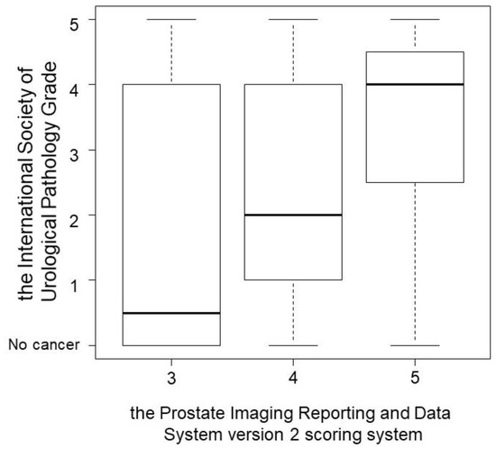 The association between Prostate Imaging Reporting and Data System version 2 (PI-RADS v2) and International Society of Urological Pathology (ISUP) grade according to the prostate cancer detection. PI-RADS v2 scores were found to significantly correlate with ISUP grade (p = 0.004).