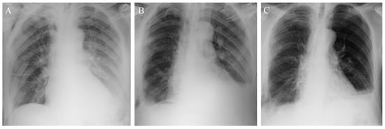 Chest x-rays from post-operative day 2 (A), post-operative day 7 (B), post-operative day 18 (C).