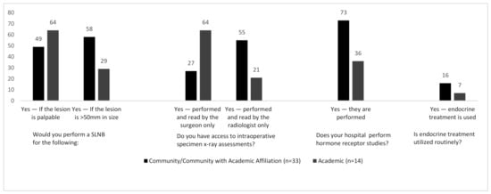 Substantial variation was seen with regards to hormone receptor studies in cases of pure DCIS. Nearly two-thirds of total participants (63%) reported that hormone receptor studies are routinely performed for DCIS. Somewhat paradoxically, only 13% of respondents reported that endocrine treatment is routinely used as part of DCIS management. Interestingly, 73% of respondents in community hospitals implied that their pathology departments perform biomarker studies whereas only 36% of those from academic centers perform biomarker analysis (Figure 2). One respondent indicated that biomarkers are performed on all DCIS lesions measuring >2 cm. Another respondent alluded to the current global COVID-19 coronavirus pandemic and suggested that all biopsies containing pure DCIS are undergoing biomarker studies, so as to commence endocrine therapy, due to the current potential limitations being placed on operating rooms and hospital resources.