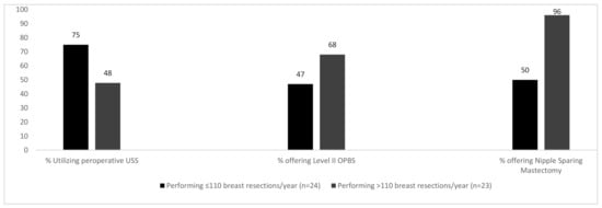 The number of breast procedures performed annually by participants heavily influenced the outcomes of the questions posed. A median of 110 breast resections was performed by all participants. Surgeons performing >110 breast resections/year were more likely to offer BCS for multicentric disease compared to their counterparts who treated fewer patients and a larger percentage of these high-volume breast surgeons were also able to offer Level II OPBS (68% vs. 47%) and nipple sparing mastectomy (96% vs. 50%)—(Figure 3).