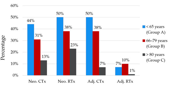Percentage of patients with rectal cancer that received either neoadjuvant or adjuvant chemoradiotherapy concurrent with surgery. Differences between each age group within each category were significant (p < 0.05). Adj. = adjuvant, CTx = chemotherapy, Neo. = neoadjuvant, RTx = radiotherapy.