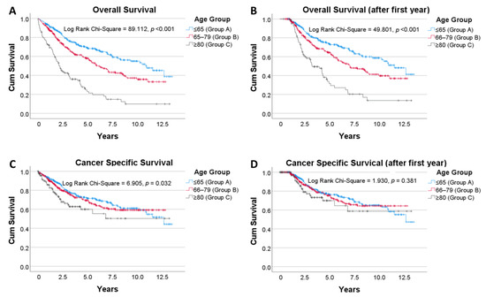 The median follow up period for the study’s participants was 45 months. The five-year overall mortality for the entire population of rectal cancer patients was 37.5% while the death from cancer-related causes occurred in 25.2% of patients. Figure 2 details the Kaplan–Meier survival analyses for OS and CSS for the entire cohort of rectal cancer patients. OS was significantly poorer for patients aged 80 when compared to the younger age brackets (Figure 2A), and this difference was maintained when deaths in the first year following diagnosis were excluded (Figure 2B). CSS was poorer for patients ≥80 (Figure 2C). When cancer-specific deaths in the first-year post-diagnosis were excluded, there was no significant difference in CSS between those ≤65, 66–79 and ≥80 years of age (Figure 2D).