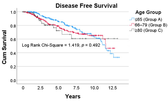 For those patients that underwent curative treatment, evidence of recurrence throughout the study period was encountered in 22.6%, 20.5% and 15.3% of patients in Groups A, B and C, respectively (p = 0.972). The site of recurrence was at a distant site in 79% of those aged ≤ 65, 70% in those aged 66–79 and 72% in those ≥80 years of age, with no significant difference between the three groups (p = 0.725). There was no difference in DFS for patients that underwent curative treatment across the three age groups (Figure 3).
