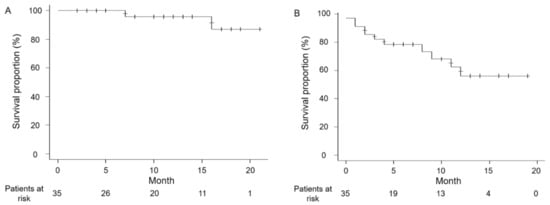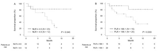 Kaplan–Meier estimates of progression-free survival (PFS) according to neutrophil-to-lymphocyte ratio (NLR) stratified by a cut-off value of 4.6 (A) and to platelet-to-lymphocyte ratio (PLR) stratified by a cut-off value of 188.1 (B). According to NLR stratification, the 1-year PFS rates were 82.6% when NLR ≤ 4.6 and 23.7% when NLR > 4.6 (p = 0.04; Figure 2A). Based on PLR stratification, the 1-year PFS rates were 81.7% when PLR ≤ 188.1 and 34.3% when PLR > 188.1 (p = 0.033; Figure 2B).