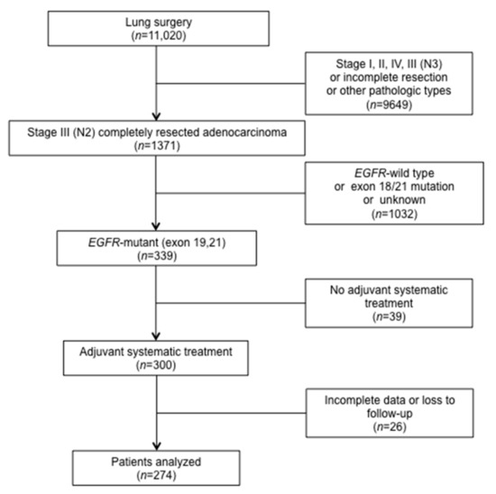 - Liu, S.R.; Qiu, B.; Yang, H.; Liang, Y.; Wang, F.; Liu, S.L.; Chen, Z.L.; Zhang, L.; Liu, M.Z.; Wang, S.Y.; et al. Epidermal Growth Factor Receptor Mutation Status and Treatment Outcome for R0-Resected Patients with Stage 3 Non-small Cell Lung Cancer. Ann. Surg. Oncol. 2016, 23, 2115–2122. [Google Scholar] [CrossRef]