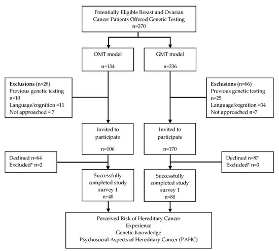 Beginning in January 2017, specific oncologists at the Princess Margaret Cancer Centre (PM) began ordering multi-gene panel testing via OMT. Initially reserved for high-grade serous ovarian cancer, OMT protocols expanded to include select breast cancer indications in August 2018 (criteria outlined in Section 4.1.3). To evaluate differences in knowledge, experience/understanding, and psychological functioning, we conducted a prospective survey study of females diagnosed with breast or ovarian cancer undergoing OMT or GMT at the PM. A pragmatic approach was used, whereby patients were offered genetic testing via OMT or GMT based on existing criteria for OMT and the preferred practice of individual oncologists. Ovarian cancer patients were enrolled from January 2017–August 2019, with the addition of breast cancer patients from August 2018–August 2019. All patients were offered multi-gene panel genetic testing, which included analysis of at least 20 genes relevant to breast/ovarian cancer risk. Patients were excluded for the following reasons: (1) previous genetic testing for hereditary cancer, (2) a relative with a known pathogenic variant in a hereditary cancer gene, or (3) unable to complete study surveys due to language or cognitive barriers. Study eligible patients were asked to complete a survey one week after consenting to genetic testing to obtain demographic information and outcomes of interest. Relevant clinical information (personal/family history of cancer, age at diagnosis, ethnicity, and genetic testing results) was collected from participant medical records. A second study survey was provided to participants one week following results disclosure to measure levels of knowledge and distress.