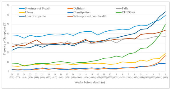 The other physical symptoms affecting the highest proportion of patients were shortness of breath (ranging from 37% to 59% across the last six months of life), loss of appetite (22–63%), and having a fall in the last 90 days (29–38%) (Figure 2). Approximately a third of the cohort self-reported poor health. Six months before death, 8% had high health instability via the CHESS score, which rose dramatically in the last month of life, peaking at 50% the week before death. Approximately 10% had delirium, ulcers, and constipation in the final weeks of life.