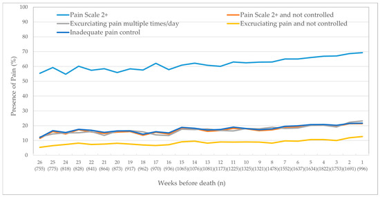 Pain: Pain was measured in five ways including (i) moderate–severe daily pain as measured by a Pain Scale score of 2 or more [17]; (ii) moderate–severe daily pain and not controlled; (iii) excruciating pain multiple times/day; (iv) excruciating pain and not controlled; (v) inadequate pain control.