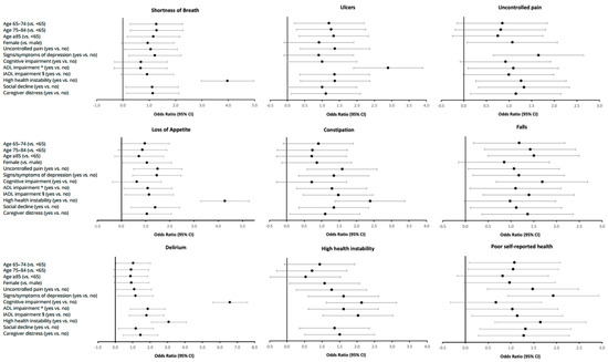 We determined the odds of having each respective physical symptom in the last three months of life, controlling for other covariates, using a multivariate regression analysis (Figure 3). Being older or female was not associated with the odds of having physical symptoms. High health instability demonstrated the strongest association with symptom burden; the greatest magnitudes were seen for loss of appetite (4.27, 95% CI: 3.93–4.64) and shortness of breath (3.97, 95% CI: 3.65–4.32). Generally, having uncontrolled pain, signs and symptoms of depression, social decline, and caregiver distress were also associated with significantly higher odds of having each of the physical symptoms, respectively. Similarly, having ADL and IADL impairment also, generally, increased the odds for having a physical symptom in the last three months of life, except for shortness of breath.