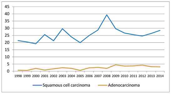 The time trends of the incidence are presented in Table 2, Table 3 and Table 4 and Figure 3, Figure 4 and Figure 5. There is an overall statistically significant increase in the studied period, of 2.49%, with a more pronounced rise, of 4.99% in the period 1998–2008. Adenocarcinoma increased considerably, with 10.54% per year between 1998 and 2014 and 12.58% per year in the period 1998–2012 (Figure 5 and Table 2).