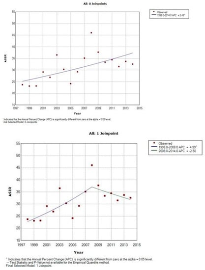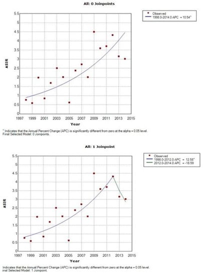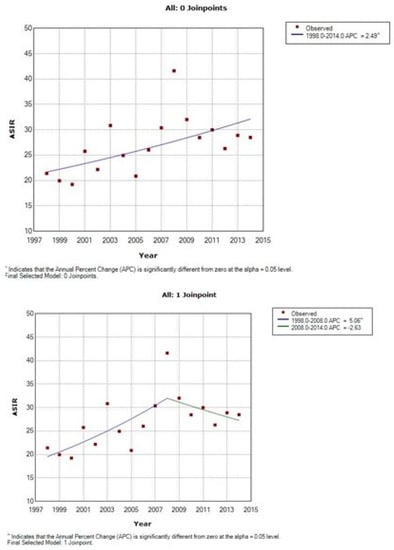 - JoinPoint Regression Program, Version 4.1.1. Bethesda USA. Available online: http://surveillance.cancer.gov/joinpoint/ (accessed on 1 October 2016).