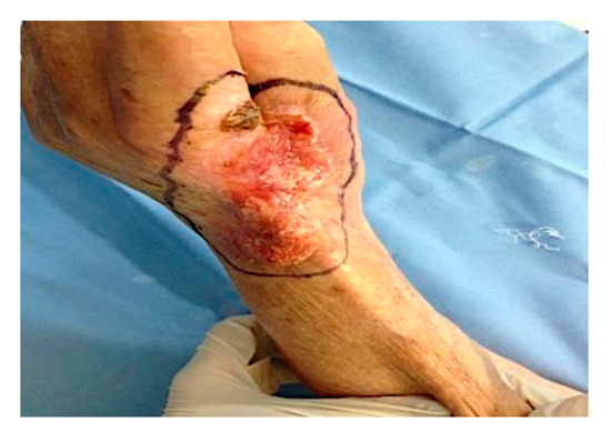 The Mohs micrographic surgery was not indicated in the clinical case treated, because it is used when a radical removal of a tumor lesion is performed, helping to specify its extent and aiming to proceed correctly with complete excision. The treated lesion was very extensive in depth, with involvement of tissues without metastases, and according to the guidelines and the articles analyzed [20,21,22,23,24,25], it was a candidate for amputation. The patient refused this intervention, and, for this reason, a combined treatment was chosen after ECT.