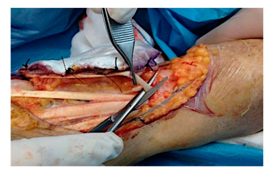 The patient underwent two ECT sessions before selective surgery. The first ECT session was performed by administering an intravenous infusion of 24.5 mg of bleomycin in 60 s and by positioning hexagonal electrodes and releasing 40 discharges from the periphery to the lesion center. After 3 months, a second ECT session was performed. After infusion of 24.5 mg of bleomycin in 60 s, 25 discharges were released from the periphery to the lesion center. The surgical removal area of the lesion, with healthy margins of 1 cm, covered the radiocarpal wrist and the first and second finger area (total area 9.5 × 5 cm) (Figure 1). Prior isolation of the tumor area was performed. Lesion excision was performed, following the radioulnar track of the radial nerve sensitive branch, with surgical selective tumor removal up to the extensor pollicis longus (EPL) tendon on the first finger, the extensor digitorum communis (EDC) tendon at the second finger and the extensor carpi radialis longus (ECRL) tendon, remaining adherent to the skeletal plane (Figure 2 and Figure 3).