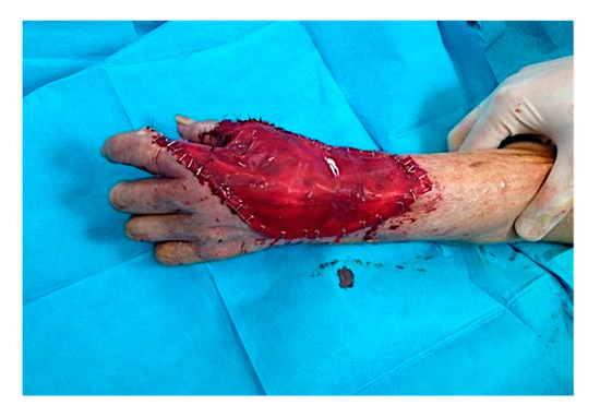 A large sheet of CDT was placed in order to cover the substance loss. The area was 12.5 × 7 cm (Figure 4). After the engraftment of dermal substitute, at around 4 weeks, the CDT cover silicone layer was removed, and the area was grafted with a thin epidermal skin graft. Therefore, selective surgical excision of the lesion was carried out by saving the rays and with minimal damage to the apposition movements, and then covered with regenerative dermis and dermal epidermal graft.