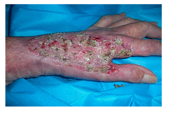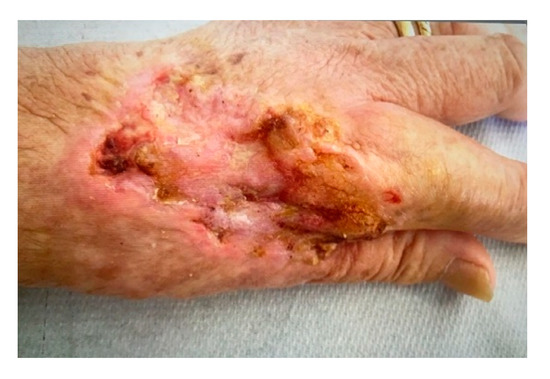 Skin cancers represent the most common primary malignancies of the hand. Squamous cell carcinoma (SCC) is the second most common malignancy skin cancer [1]. SCC is characterized by abnormal and accelerated growth of squamous cells (SCs). They typically present as painless lesions on areas of high sun exposure, such as the dorsum of the hand and upper extremity [2]. SCC contributes substantially to morbidity and mortality among elderly persons [3,4,5,6] and it is caused by cells’ DNA mutation. It is one of the most common malignancy skin cancers and its incidence increases more rapidly with age [5,6,7]. The most important etiological factors include ultraviolet (UV), ionizing radiation, and certain chemical carcinogens. The risk factors that lead to SCC development can be divided into extrinsic (UV-A, ionizing radiation, human papilloma virus (HPV), and chemical substances) and intrinsic (genodermatoses, immunosuppression, preexisting skin lesion, and preexisting actinic keratosis) [6,7]. Often, SCC develops on areas of the body exposed to UV radiation either from sunlight or from tanning beds or lamps, although it can develop anywhere [8,9]. The cancer may spread to other areas of the body, including the lymph nodes and organs [10,11,12,13]. Once this occurs, the condition can be life-threatening. For most skin SCC, the surgical excision alone is considered the gold standard practice [13,14,15,16,17]. However, recent efforts in new treatment strategies have involved around adjuvant or concomitant electrochemotherapy (ECT). ECT is a non-thermal tumor ablation modality, safe and effective on any type of solid tumor [14,15,16,17,18,19]. We present the case of an 87-year-old patient affected by hand SCC with invasion of deep structures including tendons. The patient refused the possibility of limb amputation as a first line therapy, proposed by our institute. Therefore, the surgical team decided to treat the lesion with neoadjuvant intra-tumoral ECT with bleomycin sessions [20,21,22,23,24,25], as a preservative treatment, in order to obtain a reduction in the tumor size and then to proceed with the selective surgical removal and substance loss reconstruction with collagen dermal substitute template (CDT). A specific written informed consent was provided before the treatment. This study confirms the efficacy and safety of combined treatment and its benefits. Therefore, selective surgical tumor excision combined with ECT and CDT is a valid technique for extended-deep dorsal hand tumor lesion reconstruction. Based on our clinical case report, we can affirm that the combined technique is ideal for elderly patients, it reduces National Sanitary System (SSN) costs, and it is cost-effective compared to radical amputation, therefore increasing the patient’s quality of life.