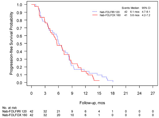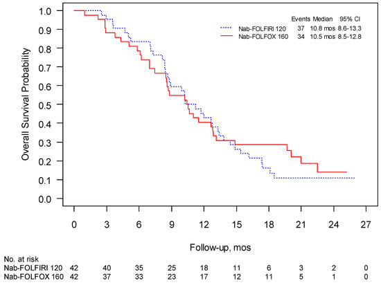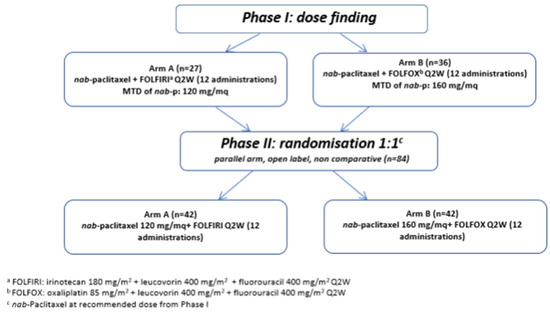 Giommoni, E.; Maiello, E.; Vaccaro, V.; Rondini, E.; Vivaldi, C.; Tortora, G.; Toppo, L.; Giordano, G.; Latiano, T.P.; Lamperini, C.; et al. Activity and Safety of NAB-FOLFIRI and NAB-FOLFOX as First-Line Treatment for metastatic Pancreatic Cancer (NabucCO Study). Curr. Oncol. 2021, 28, 1761-1772. https://doi.org/10.3390/curroncol28030164